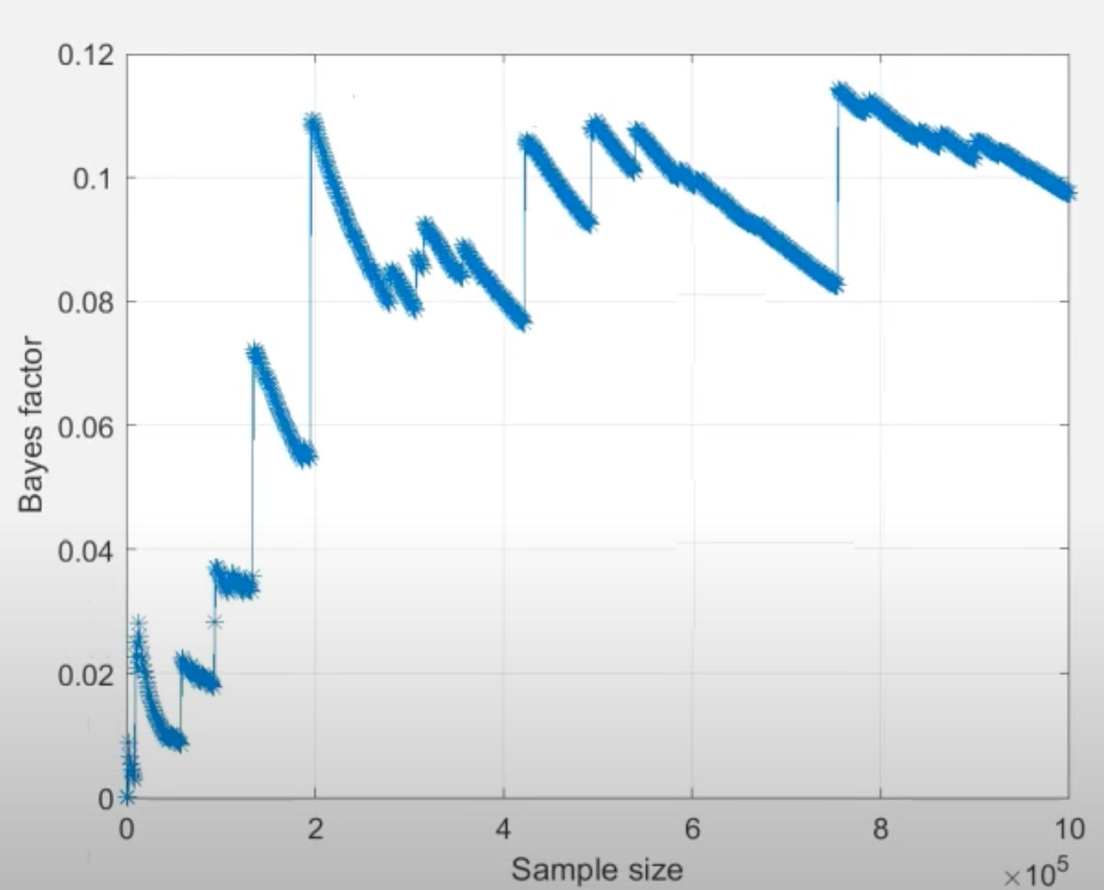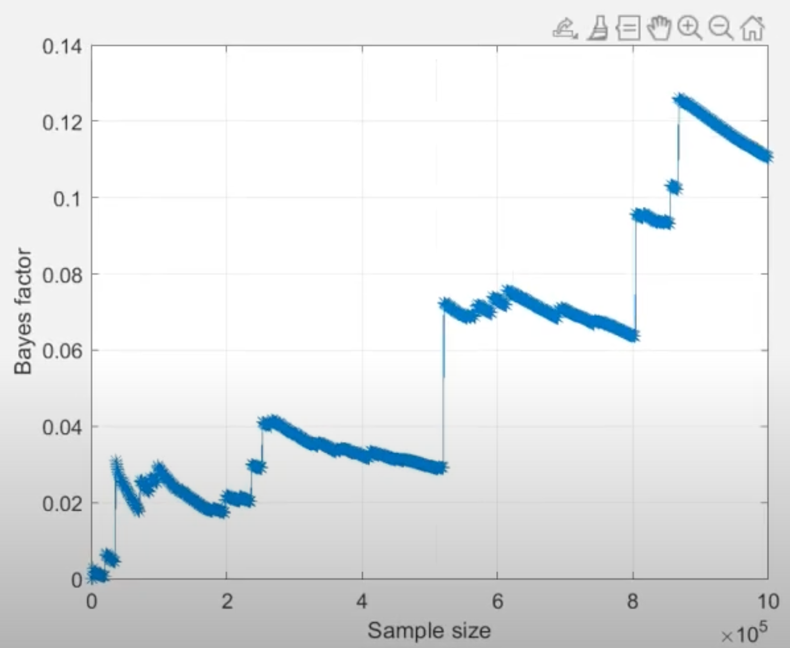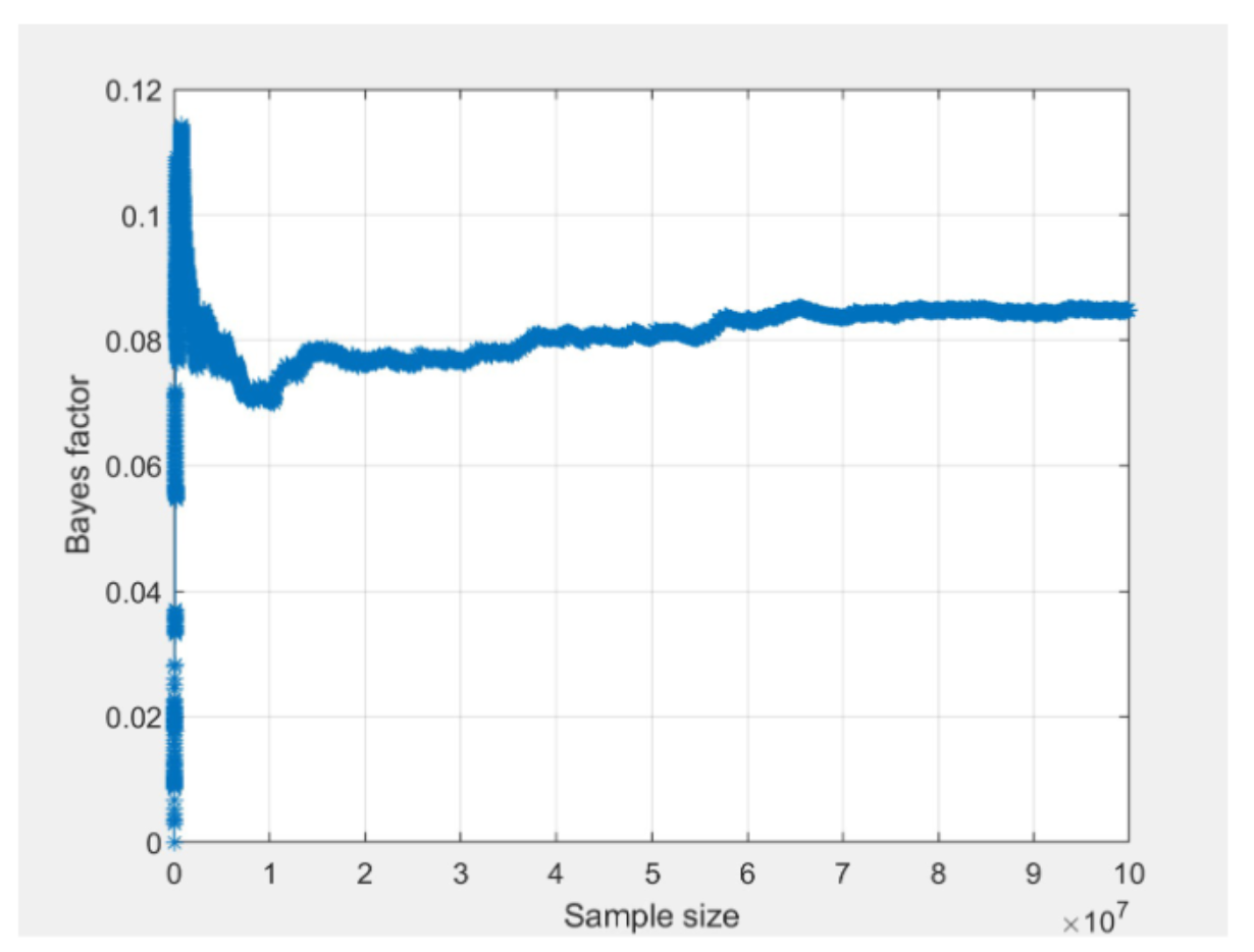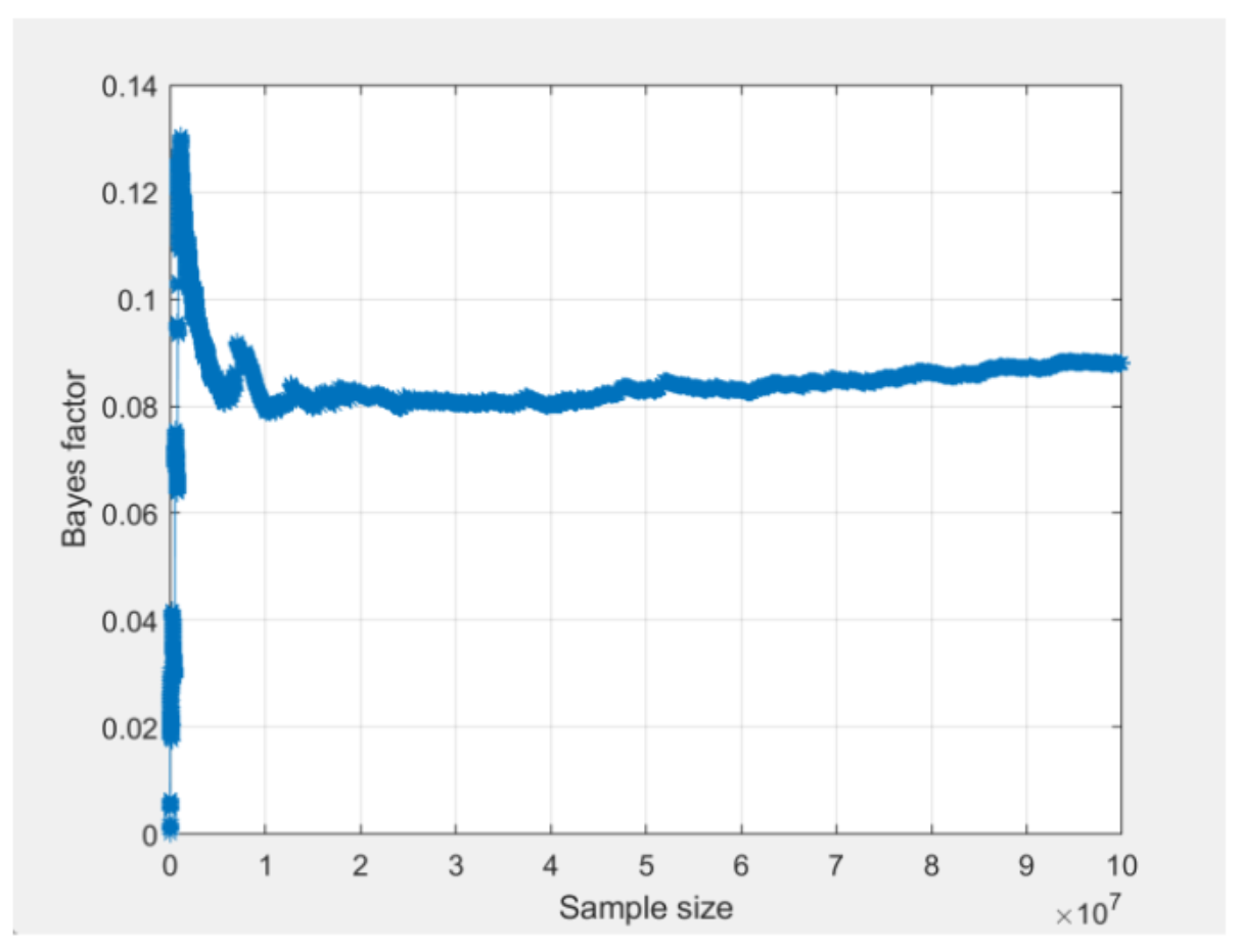 If the range \(0.1 \pm 0.02\) is correct, the conclusion that this model is not viable does not depend on obtaining a higher level of precision for the Bayes factor estimate. Depending on the situation, it may, therefore, not be critically important to invest more computing power and time into achieving higher precision for this Bayes factor (but see below).