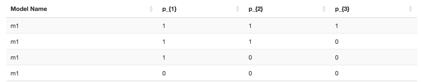 This geometric figure is known as a polytope, which can be characterized by vertices. A vertex \(V_i\) corresponds to a point \(i\) in the three-dimensional space defined by the coordinates \((p_1, p_2, p_3)\) in the example with three conditions. For the model in the example, we identify four vertices: \(V_1 = (1, 1, 1)\), \(V_2 = (1, 1, 0)\), \(V_3 = (1, 0, 0)\), and \(V_4 = (0, 0, 0)\).